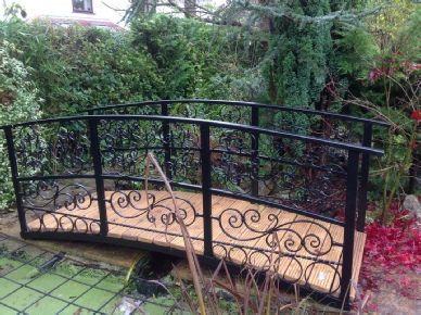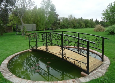 The Berriew design is my most intricate design of garden bridge, ideal for the formal classical garden. The Berriew has a shallow arc, ideal for ease of crossing. It also makes it ideal for a special wide bridge to facilitate crossing with a ride on mower. The Berriew latest design option is also ideal for customers concerned about child safety as there are no sizeable gaps in the metalwork.